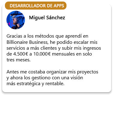 Billionaire VIP te proporcionará las herramientas, la mentalidad y las estrategias personalizadas necesarias para escalar significativamente tu negocio, multiplicar tu facturación y disfrutar del estilo de vida empresarial que siempre has deseado.